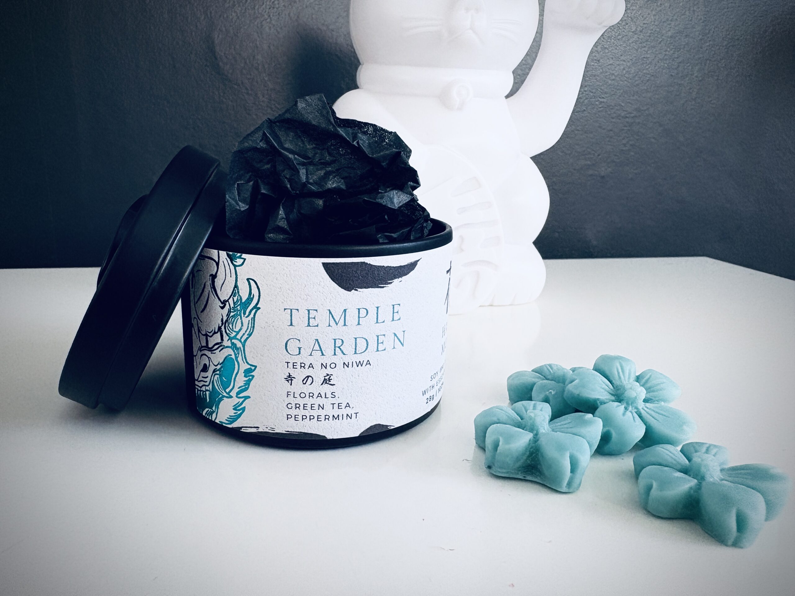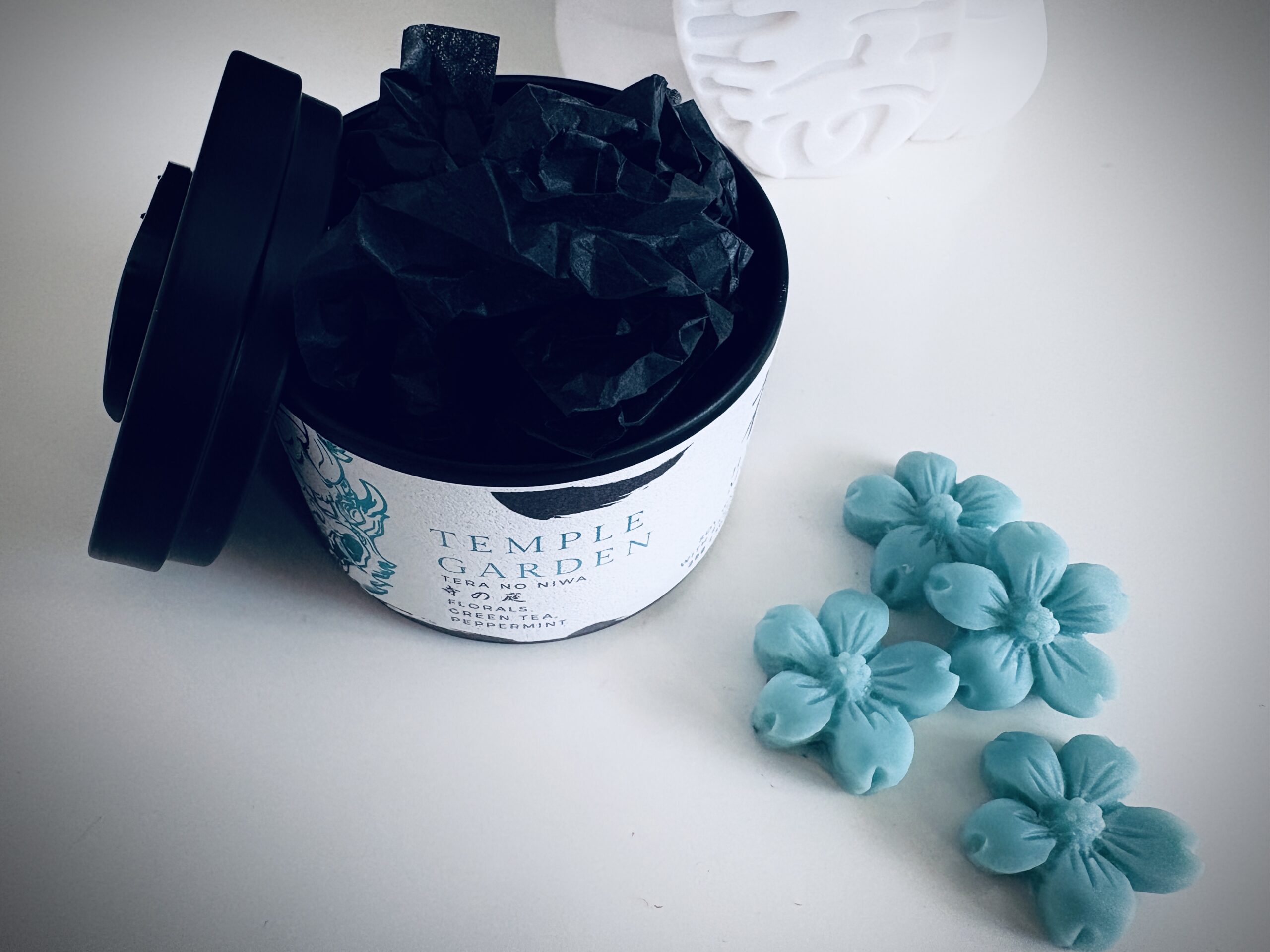 For a limited time, snap up these mint green tea sakura wax melts in the same fresh scent as my Hannya Demon mask candle but these have extra peppermint essential oil! A great way to sample the scent if you’re not sure about committing to a full candle. This sweet little tin of 10 melts has the addition of pearl mica to give a lovely liquid metal look to the wax once melted. And they smell so good! Amazing scent throw on these, 2 blossoms is all you need in your melter to fill your room with a fresh minty tea aroma, like being in a zen temple garden. Ideal for gifting, not your average wax melt!
